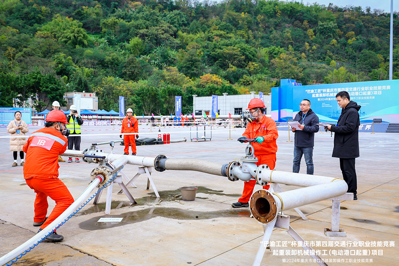 本次大赛由重庆市交委、人社局主办,重庆市港航海事事务中心、职业技术鉴定指导中心、重庆港、区交委承办,长寿港航海事事务中心、化码公司协办。大赛设置电动港口起重竞赛和流体装卸竞赛两个项目,采取理论知识竞赛和实际操作竞赛相结合的方式,内容涵盖港口作业操作、应急救援、应急处置、法律法规等,全面检验参赛选手的知识储备、综合能力和现场操作技能。电动港口起重竞赛与重庆市职业技能等级鉴定挂钩,参赛选手决赛实操技能成绩合格者,可按规定获得与命题等级对应的职业技能等级证书。