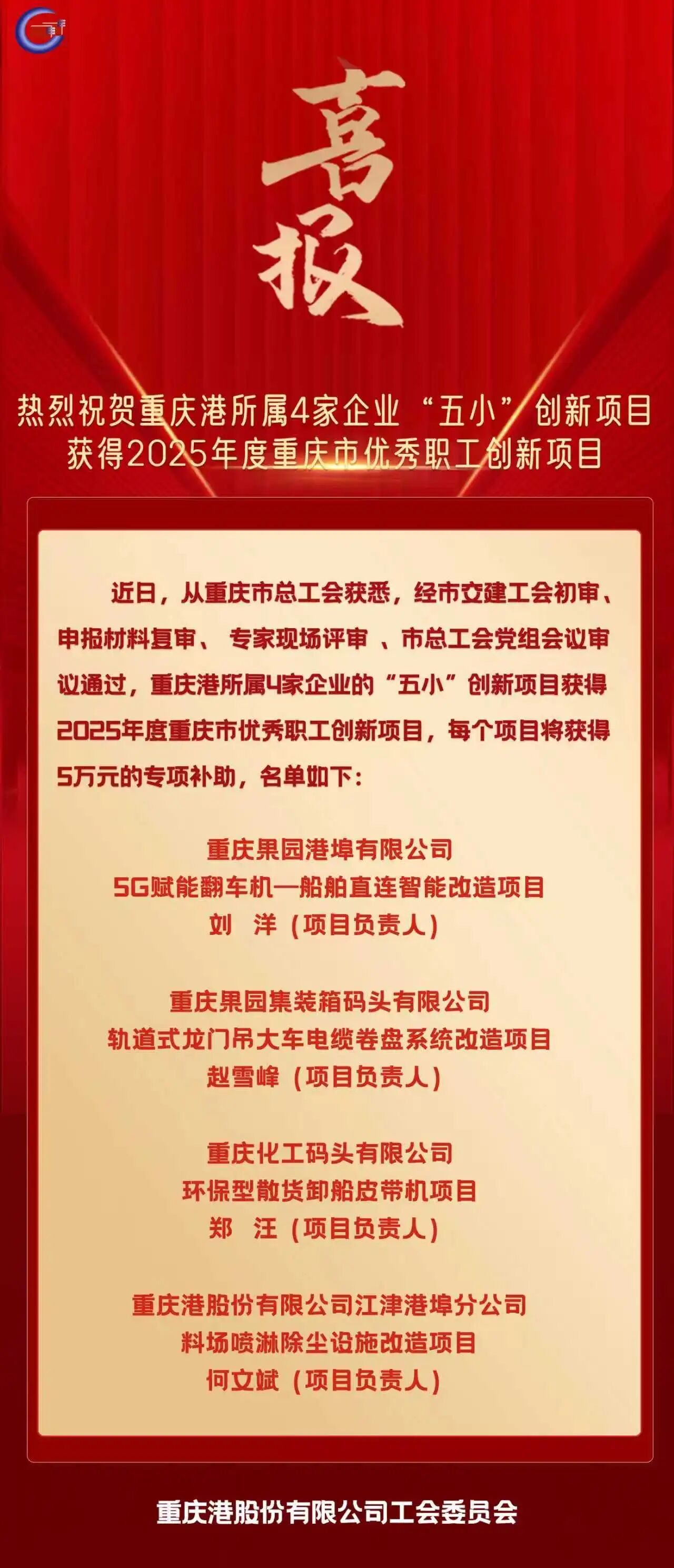 喜报!热烈祝贺重庆港所属4家企业“五小”创新项目获得2025年度重庆市优秀职工创新...