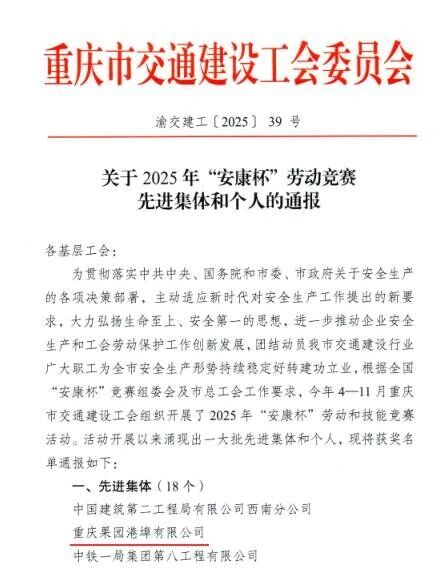 喜报!重庆港所属果园港埠公司、果园集装箱公司在市交建工会2025年“安康杯”劳动...